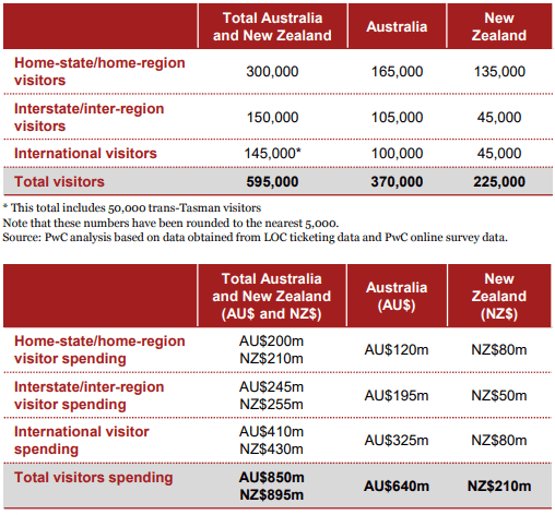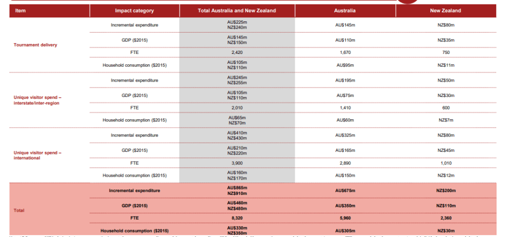 - Below, again, are the economical figures produced from the World Cup in 2015. It can be predicted that this years 2020 tournament will provide similar results, but be more successful at the same time. See, as their are less teams and less games in the tournament, ticket revenue will not be as high, but as the merchandise, tourism and other visitor spending will be higher than usual, it will allow for somewhat similar Total Direct expenditure results to be produced and have a similar impact on Australia’s GDP, Jobs created and household consumption.