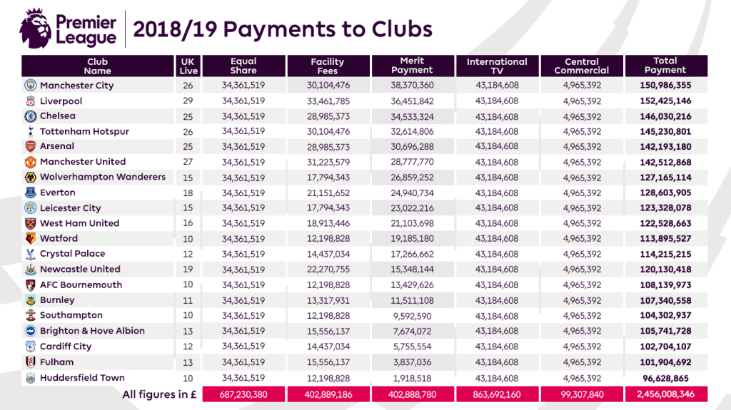 The Premier League is the most watched league in the world with a cumulative 3.2 Billion views in the 2018/19 season. Many rich enterprises uses this opportunity to gain wide exposure by advertising their products during matches. The income generated by them elevates the Prem to be by far the richest league in the world, earning nearly £2.5 Billion that season.