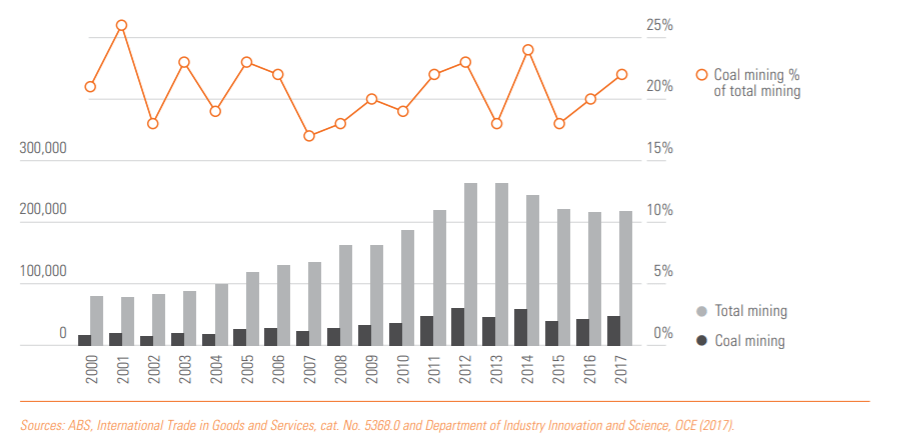 However, the national univeristy has predicted that the coal industry will be a dying industry, with the rise of renewable energy on the rise. In the past 15 years, Coal has had an 80% share in electrical production in the past 15 years, now renewable energy holds around 23% of the electrical production in Australia. since renewable energy is constantly getting cheaper, it is predicted that the coal industry will start declining. As shown in the picture, coal mining has been fluctuating within the past 5 years, and the future is coal is uncertain. Although the coal exports should be stabe within the next 10 years, the national university has predicted coal to start declining after this time period.