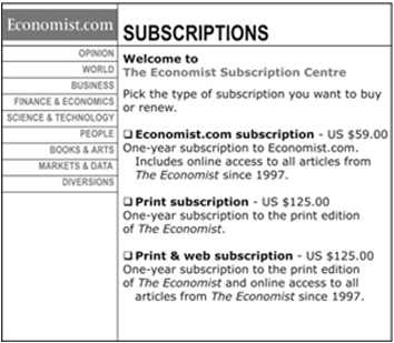 This is perhaps the most famous example of the decoy effect is the pricing structure of The Economist. In the photo above, it can be seen seen that The Economist has 3 pricing options. A digital only for $59, a print only for $125, and a digital and print for $125. Behavioural economist, Dan Ariely carried out an experiment using this pricing structure. First, he gave his student all three options, and he found that out of a 100 students;