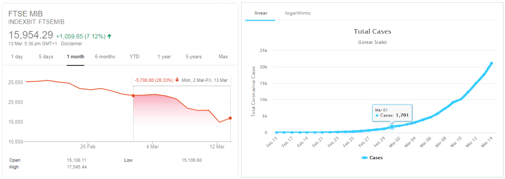 Public health responses have included travel restrictions, quarantines, event postponements or cancellations, and facility clousres. These include a quarantine of the Hubei province of China, the nationwide qurantine of Italy and Spain, various border closures or incoming passenger restrictions and school and work closures. These responses and restrictions imposed from countries and world organisations, have proven to have a significant impact on the economy all around the world. Evidence of economic impact due to the outbreak of coronavirus include; the Dow Jones stock market index dropping 2,000 points in one day which is a record drop for the index, before a +1,985 points increase in one day, which is also the record gain for the index. Another piece of evidence surrounding the economic impact that this pandemic crisis will have, is the shutdown of the entirety of Italy, after a surge in cases (over 17,000 cases developed from 1st of March to 14th of March), forced the Italian Government to stop all operations in the country, which included the closure of schools, universities and businesses.