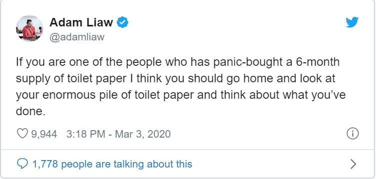 1. The effect of herd behaviour and pack mentality can be absolutely overwhelming, as seen in this toilet paper fiasco. Amidst the chaos of the COVID-19 outbreak, we should really be focusing on being alert but not panicked so that everyone in society can get through it.