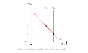 Expansionary Monetary Policy increases the money supply in an economy. This is done by the central banks to accelerate economic growth, when the economy is producing less than what it could at full capacity, or to tackle unemployment. Increasing the money supply, lowers interest rates which promote the growth of business investment and private consumption within the economy. Lowered interest rates make it cheaper for people and businesses to take out loans , which in turn leads to the greater expansion of businesses and in turn greater economic output. In Figure 1, the supply curve shifts to the right, thereby dropping the interest rate from i1 to i2.