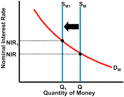 Contractionary Monetary Policy decreases the money supply in an economy. Sometimes the output of an economy is greater than its potential output, which is the maximum amount of good and services an economy can produce at maximum efficiency. This is caused by a massive demand for goods and services and can cause an economy to “overheat” and this can cause an upward pressure on inflation. Hence , central banks decrease the money supply which increases interest rates, and thereby discourages business investment by increasing the cost of borrowing; and discourages private consumption by encouraging saving. This event usually decreases the output of an economy , thereby slowing inflation and economic growth. In Figure 2, the supply curve shifts to the left, which increases the interest rate from NIR to NIR1.