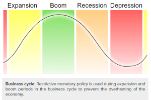 - Contractionary MP aims to slow down economic growth to prevent “overheating” and generally takes the form of high-interest rates.